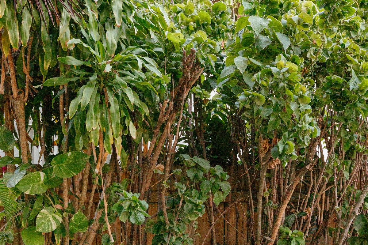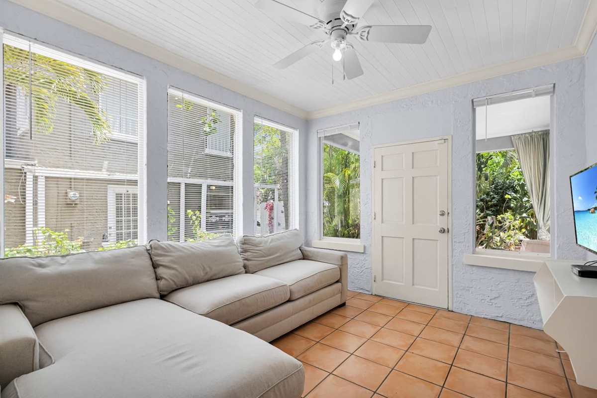 As you step into the backyard, you're immediately enveloped by lush surroundings in the shared outdoor spaces. Here, you'll find the tropical garden area which includes a heated saltwater plunge pool in the backyard, a wooden deck, comfortable outdoor chairs, grill and a barrel sauna. The spacious outdoor space is nestled between the main house and rear cottages, a wonderful place to enjoy a quiet morning coffee surrounded by palms or soak up the sun. The garden boasts numerous delightful seating areas and well portioned spaces.