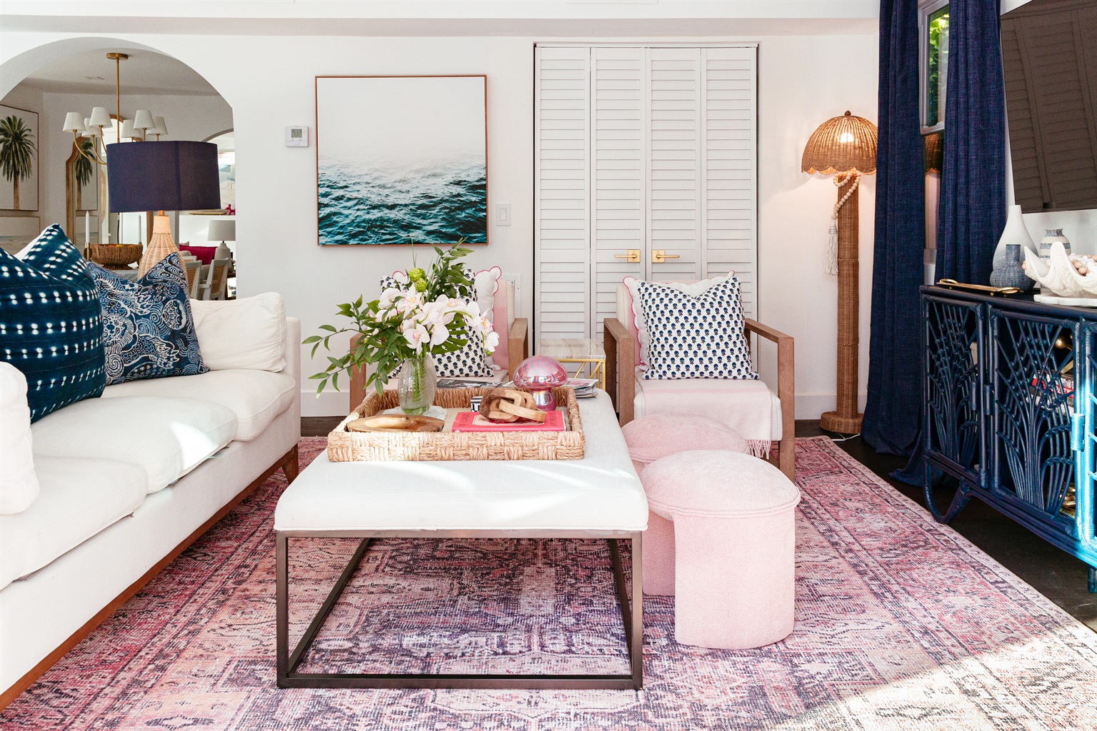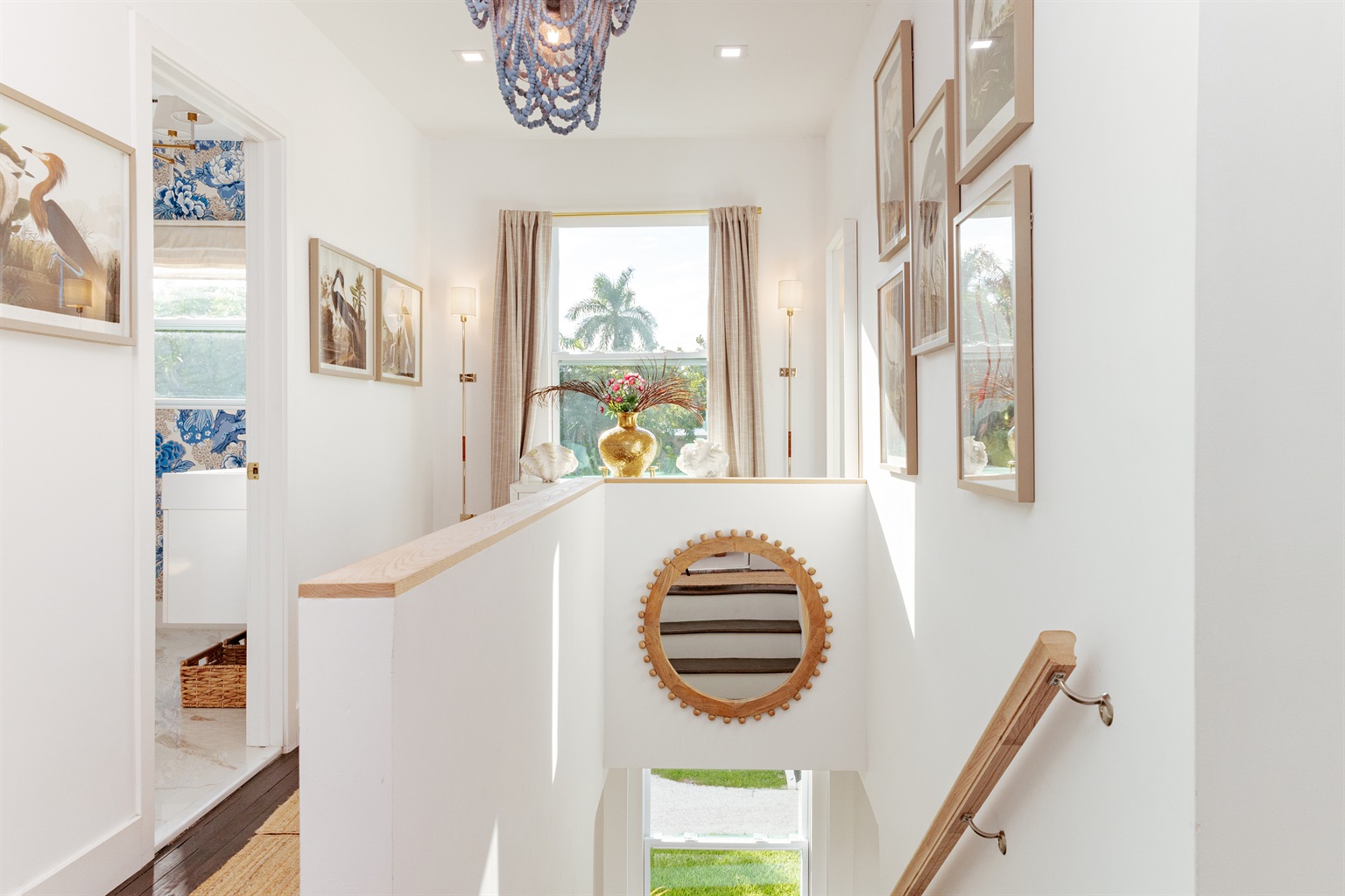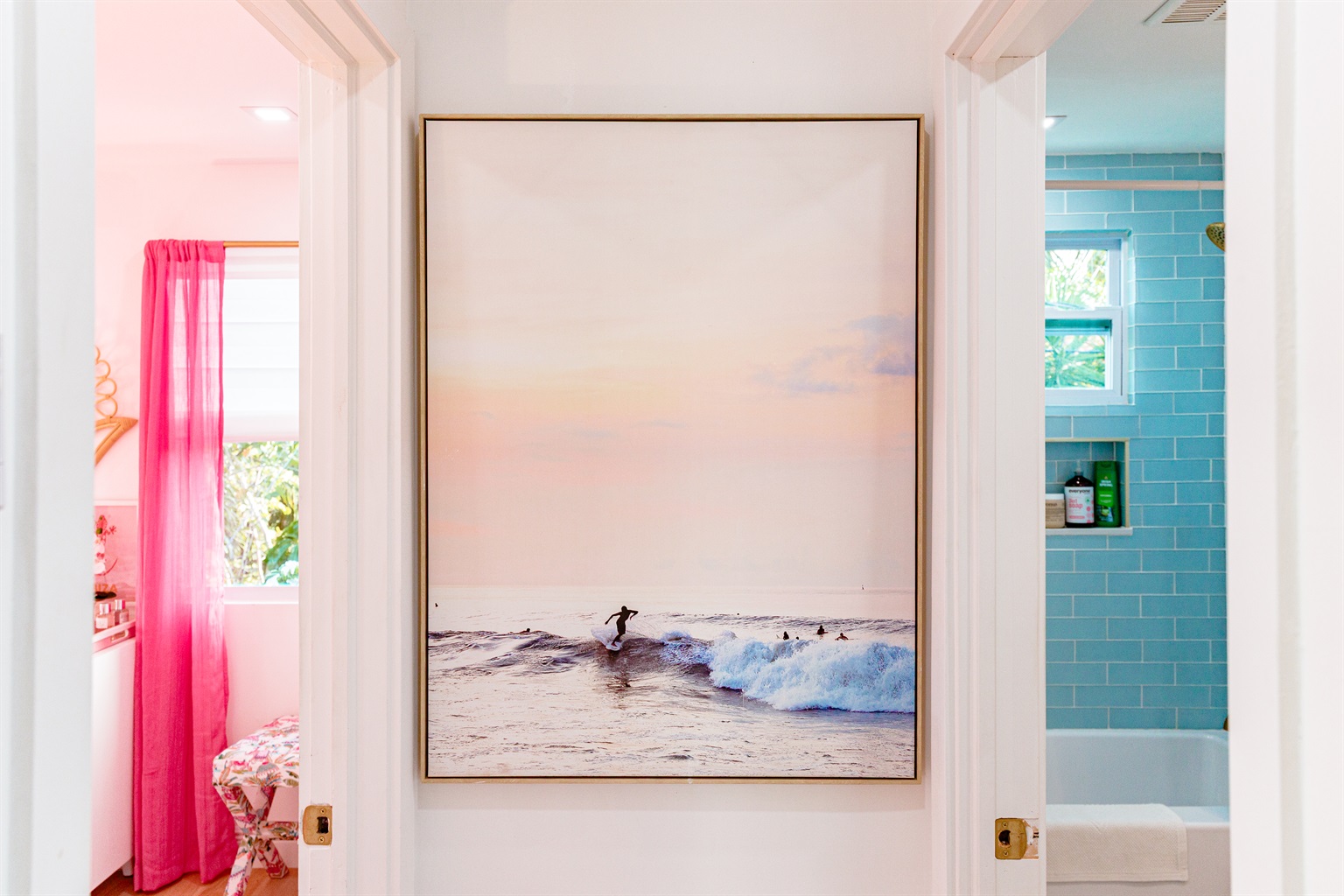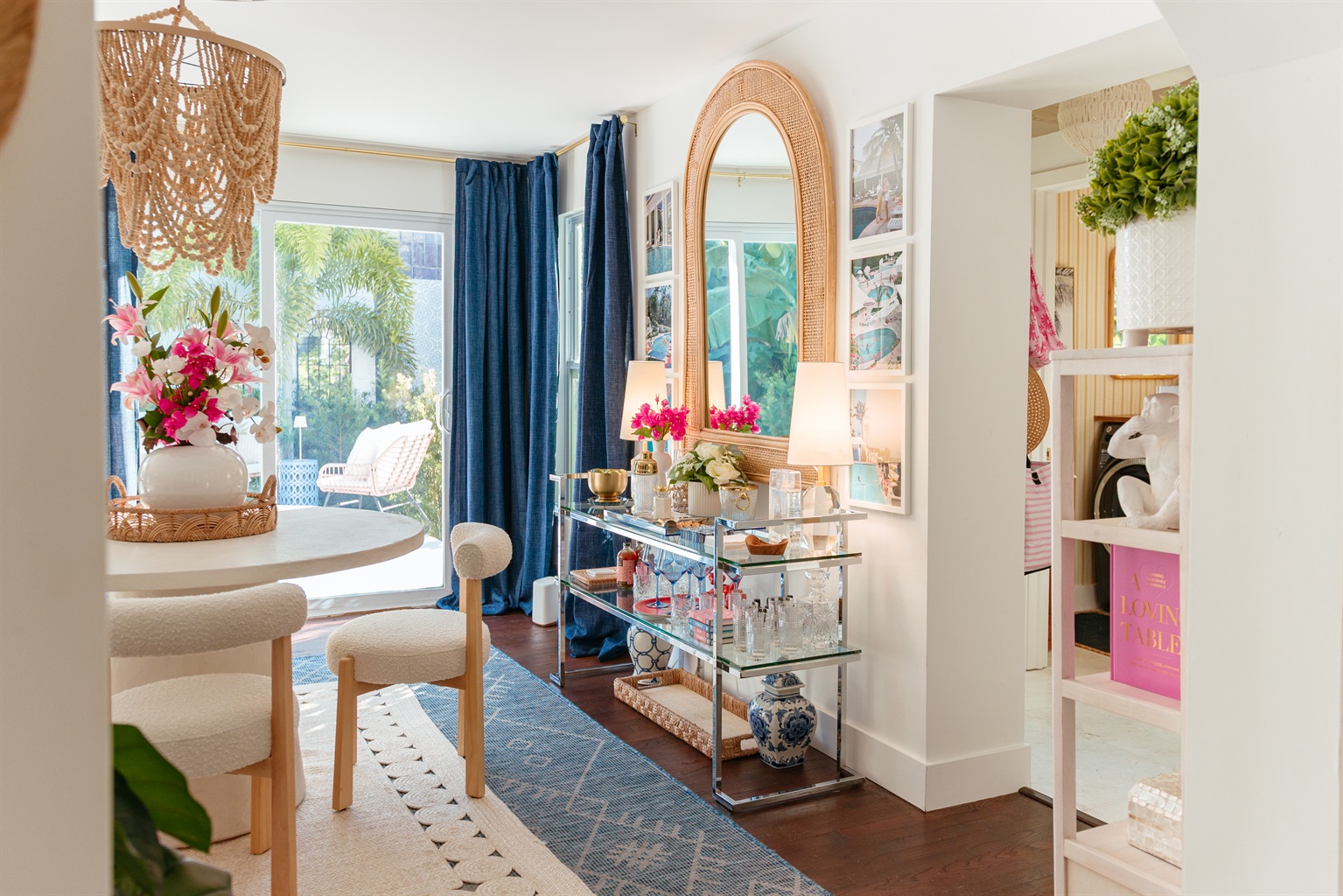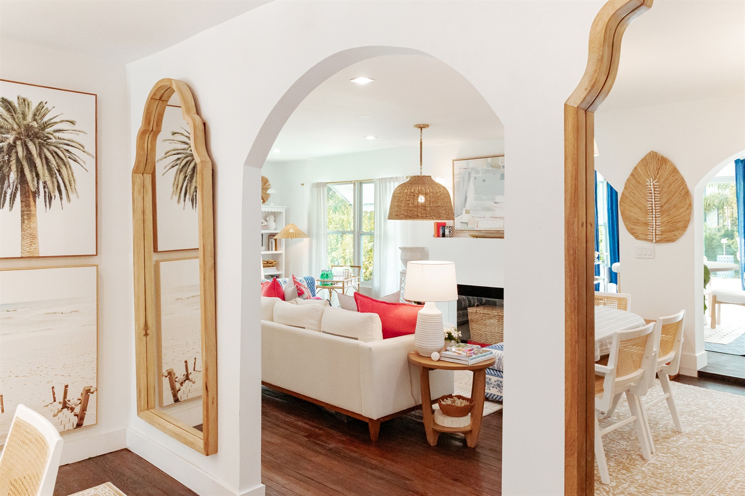 As you enter the cottage, you're greeted with an accent wall that highlights Palm Beach vibes.