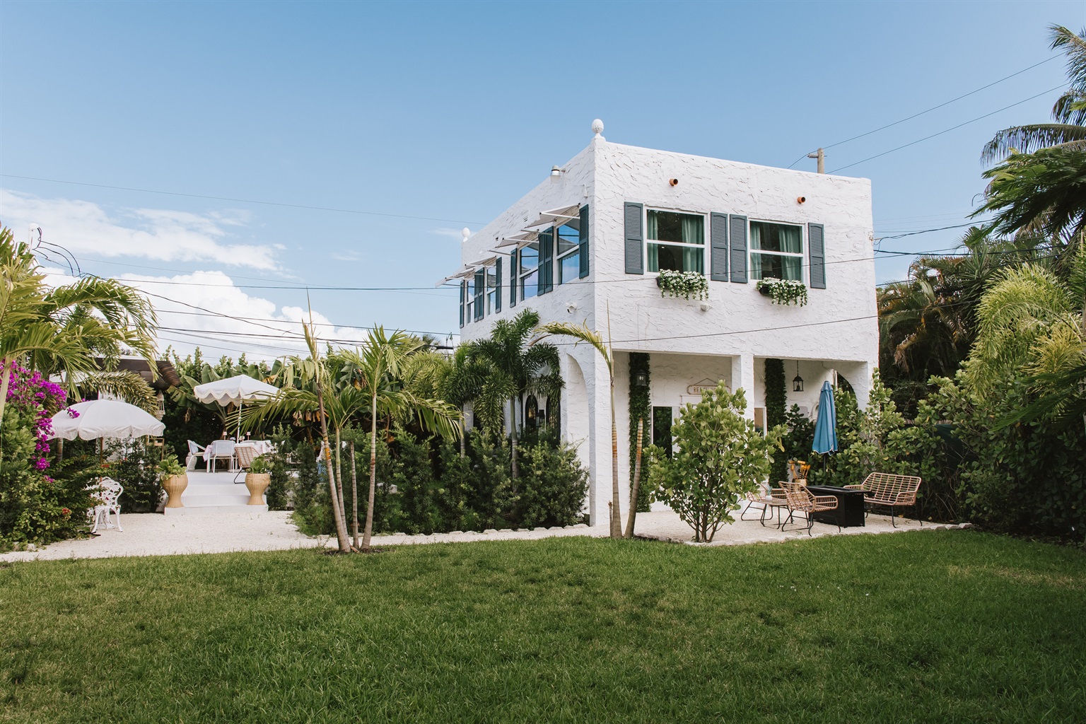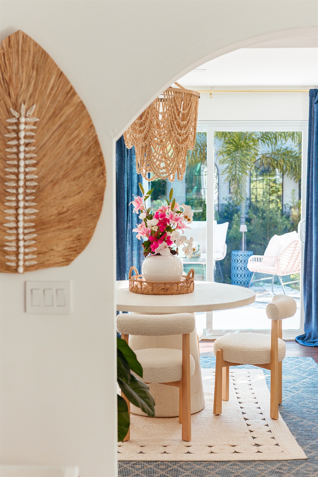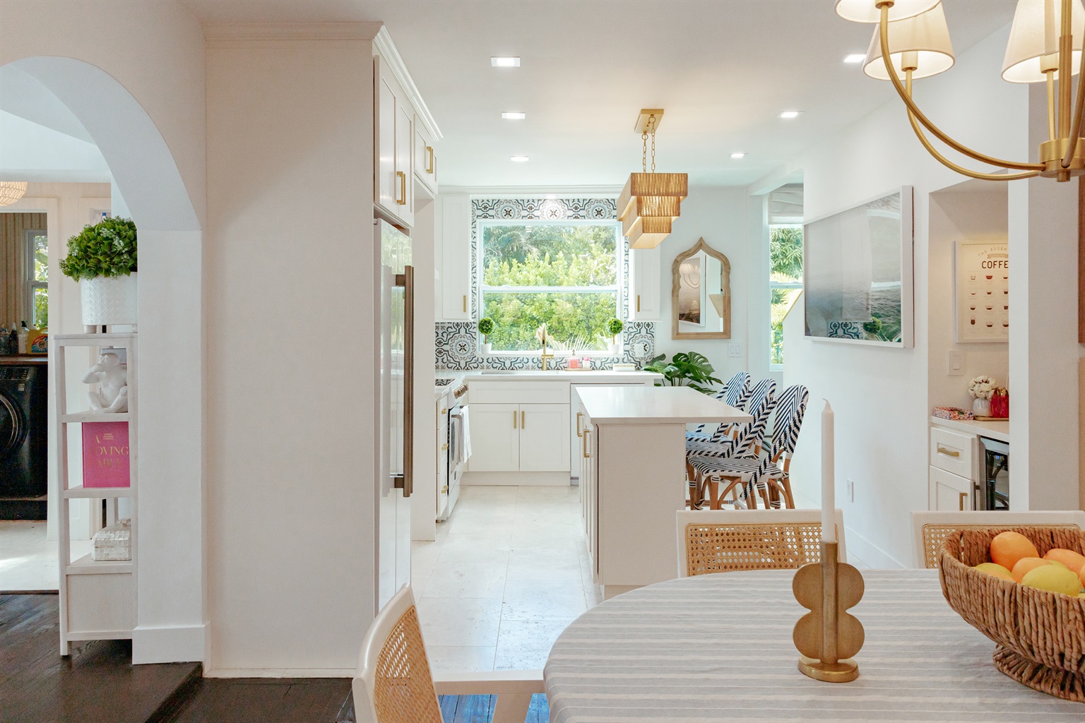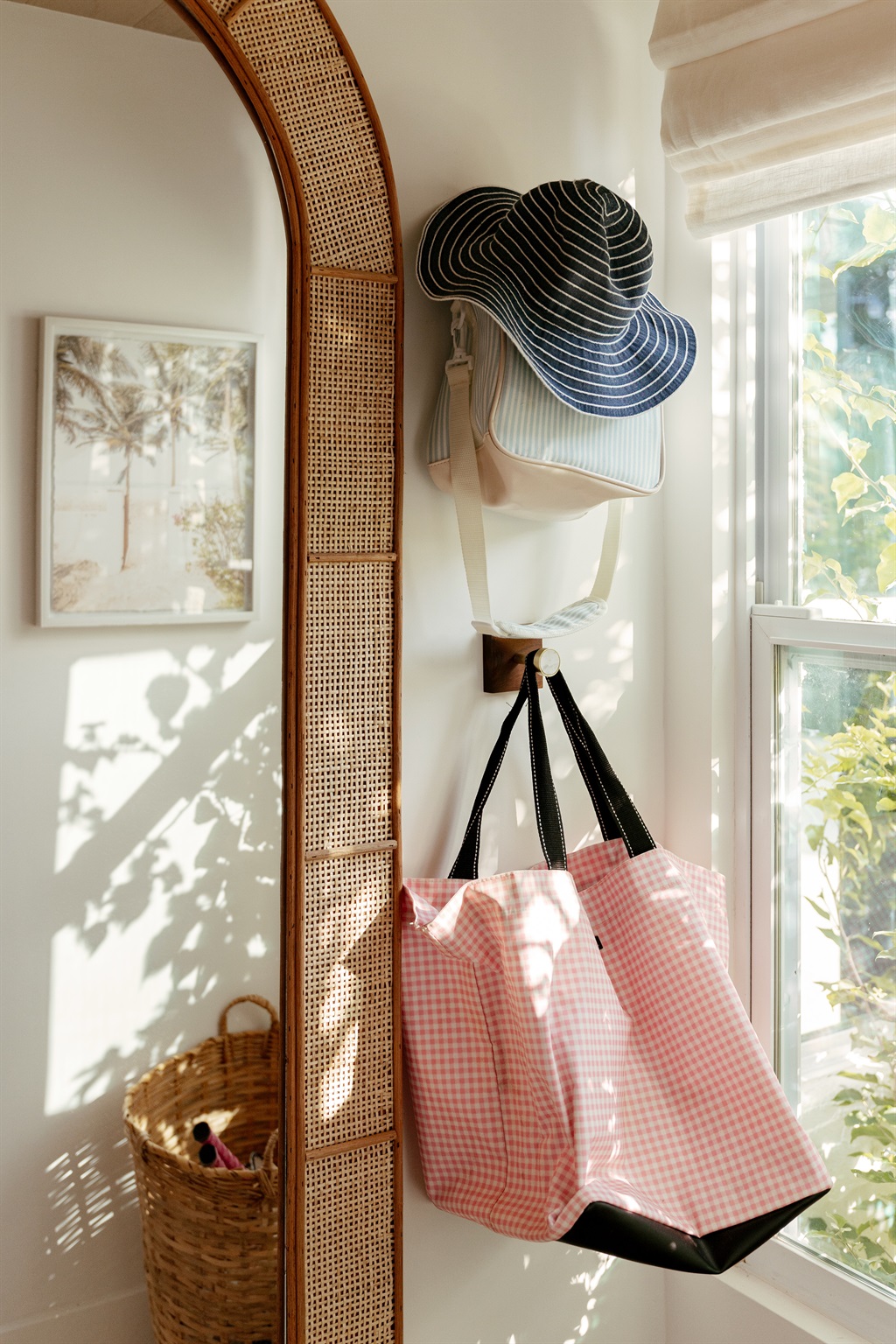 As you enter the cottage, you're greeted with an accent wall that highlights Palm Beach vibes.