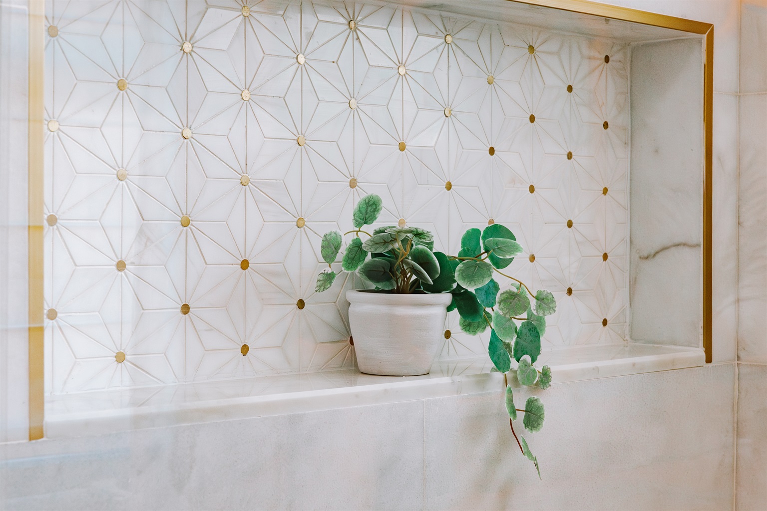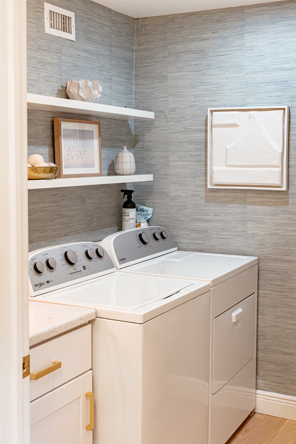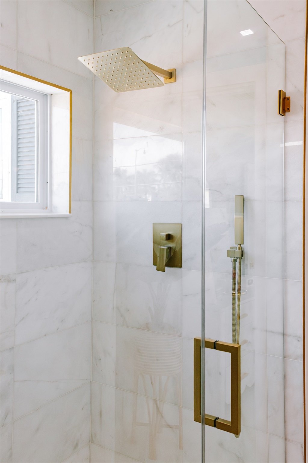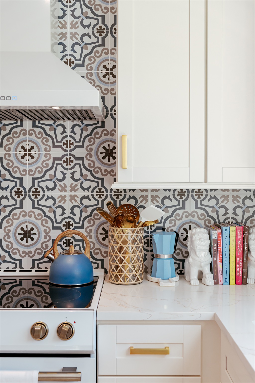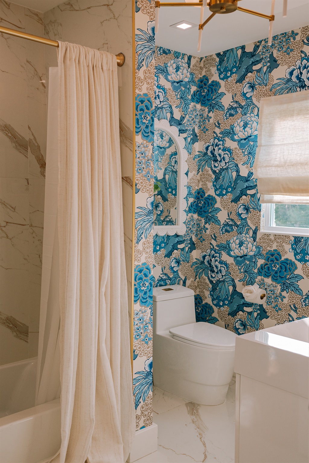 The shared full bathroom delights with colorful wallpaper and impeccable finishes.