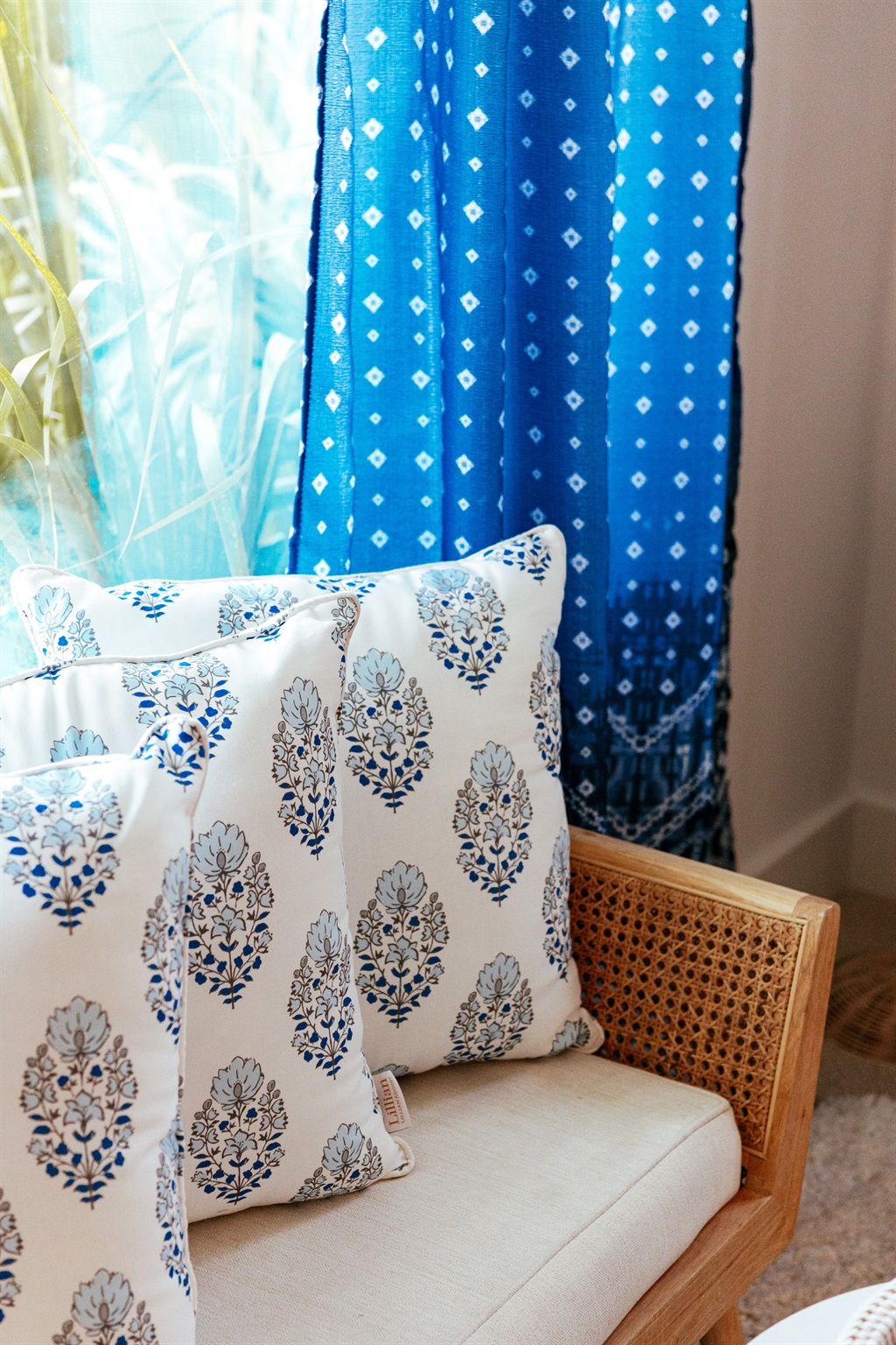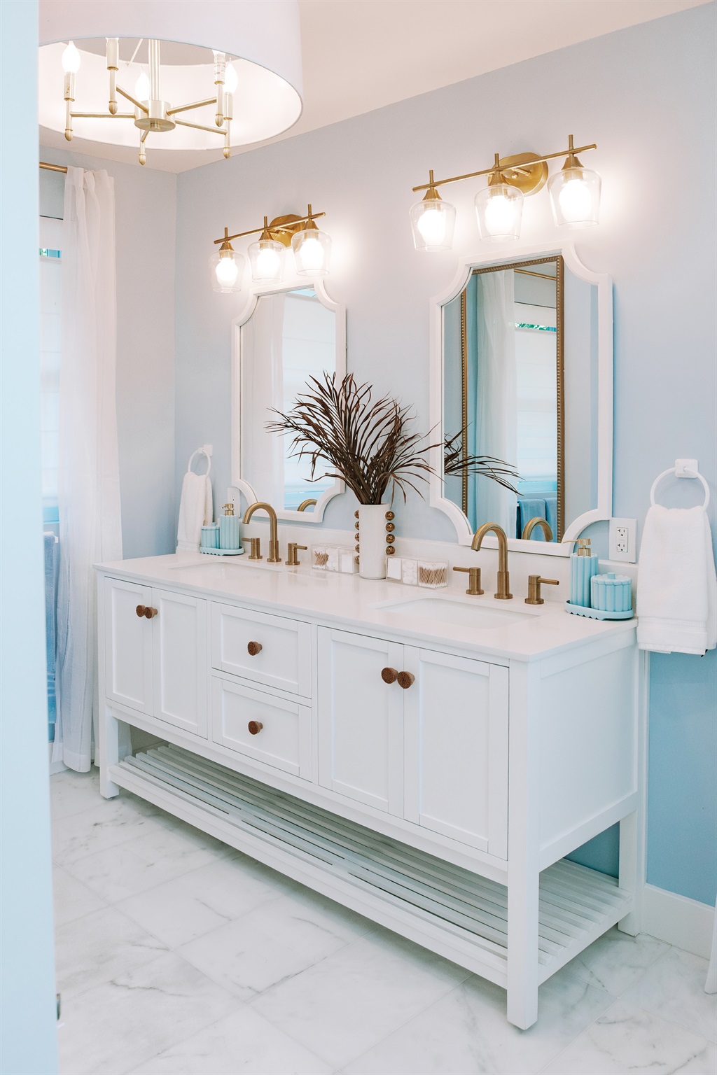 The cottage bathroom exudes palms and ocean in shades of blue and green.
